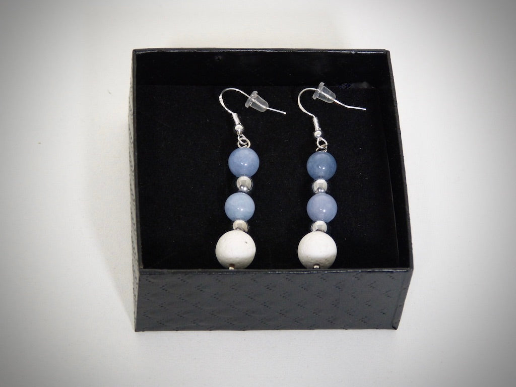 Je vous propose ces Boucles d'Oreilles en Pierres naturelles Aigue marine et Pierre de lave blanche fabriquées par mes soins dans l'Aveyron.