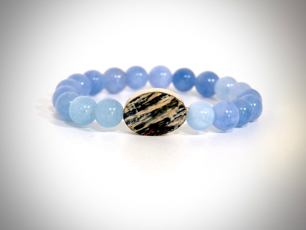 Je vous propose ce Bracelet Ivoire de Mammouth et Pierres naturelles Aigue-Marine de grande qualité classées AAA fabriqué artisanalement par mes soins.