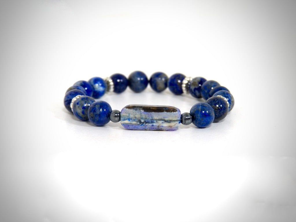 Je vous propose ce Bracelet Molaire de Mammouth Bleu,Lapis Lazuli et Hématite fabriqué artisanalement par mes soins.