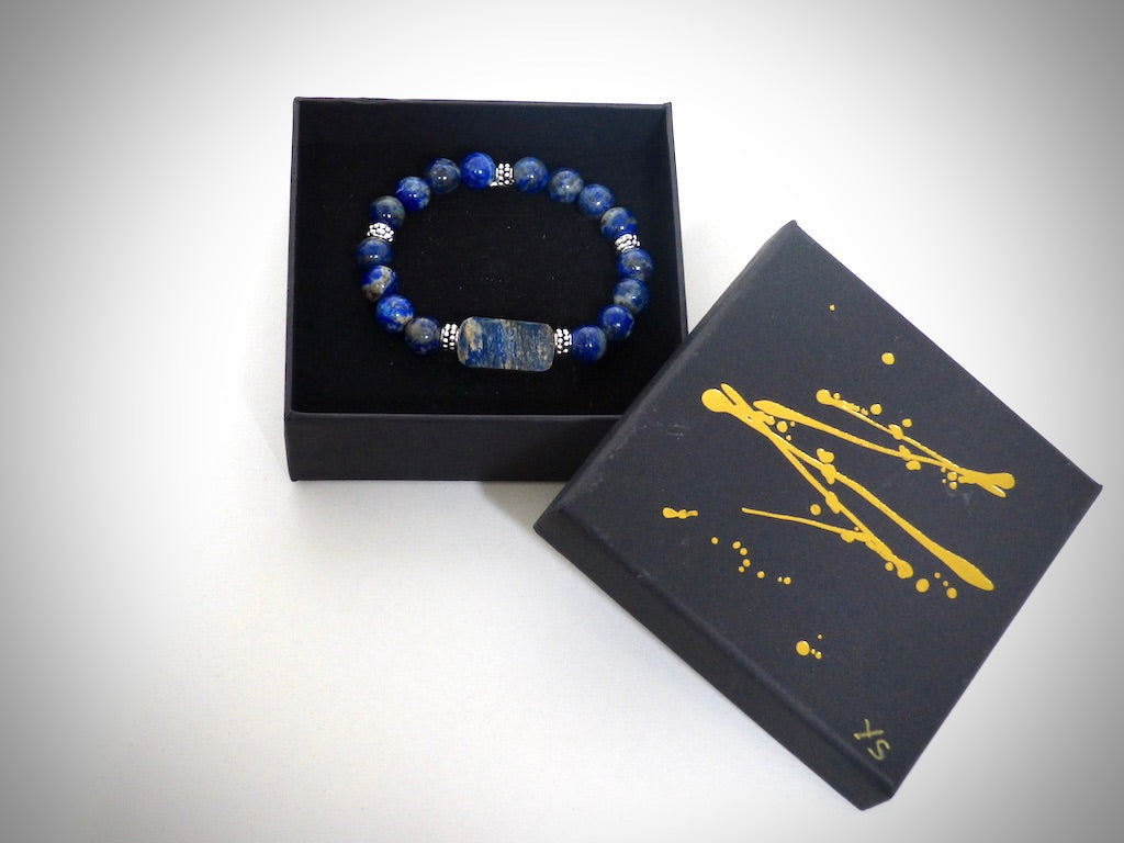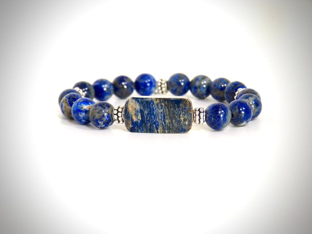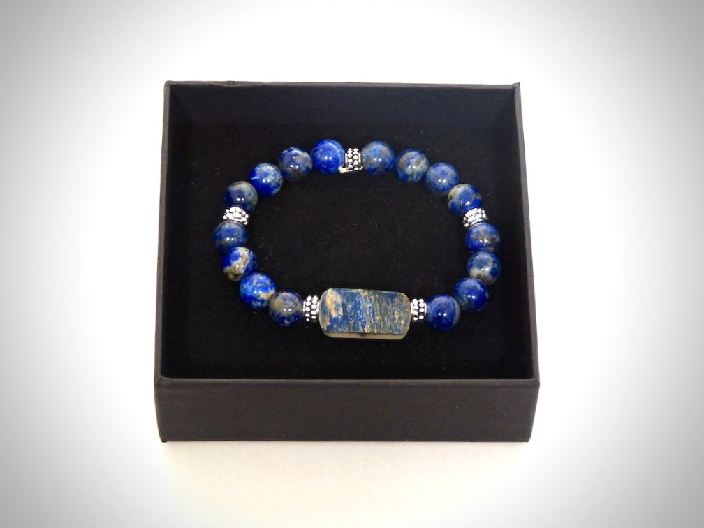 Je vous propose ce Bracelet Molaire de Mammouth Bleu et Pierres naturelles Lapis Lazuli de grande qualité classées AAA fabriqué artisanalement par mes soins.