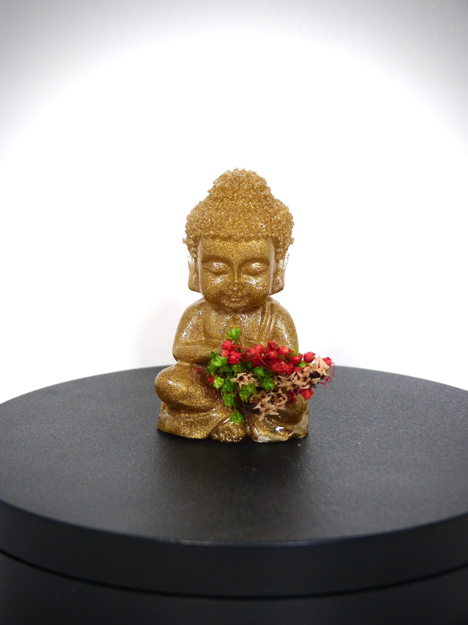 Je vous propose ce petit Bouddha qui saura embellir votre intérieur en toute discrétion. Je l'ai fabriqué avec de la résine que j'ai agrémenté de fleurs séchées