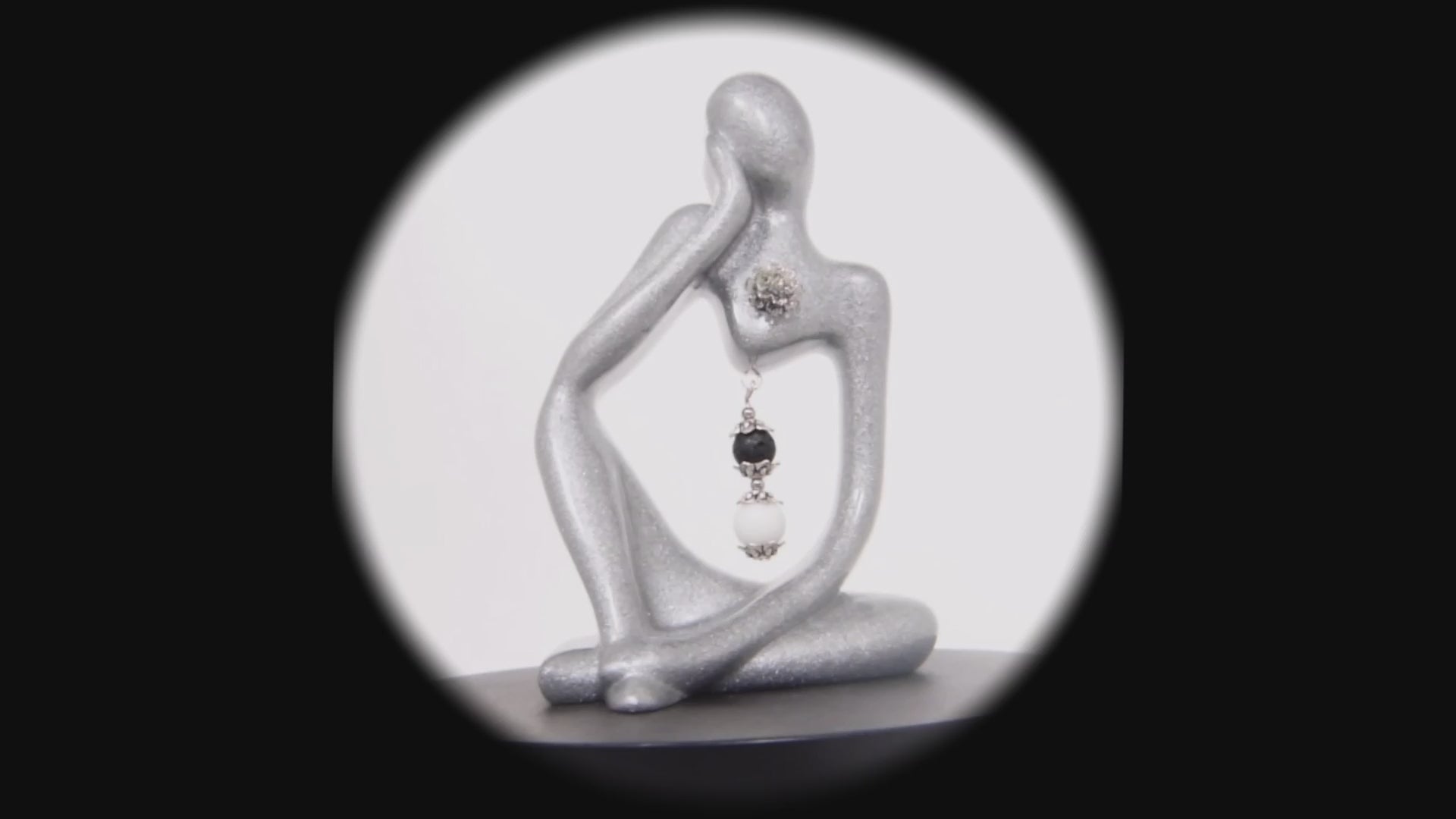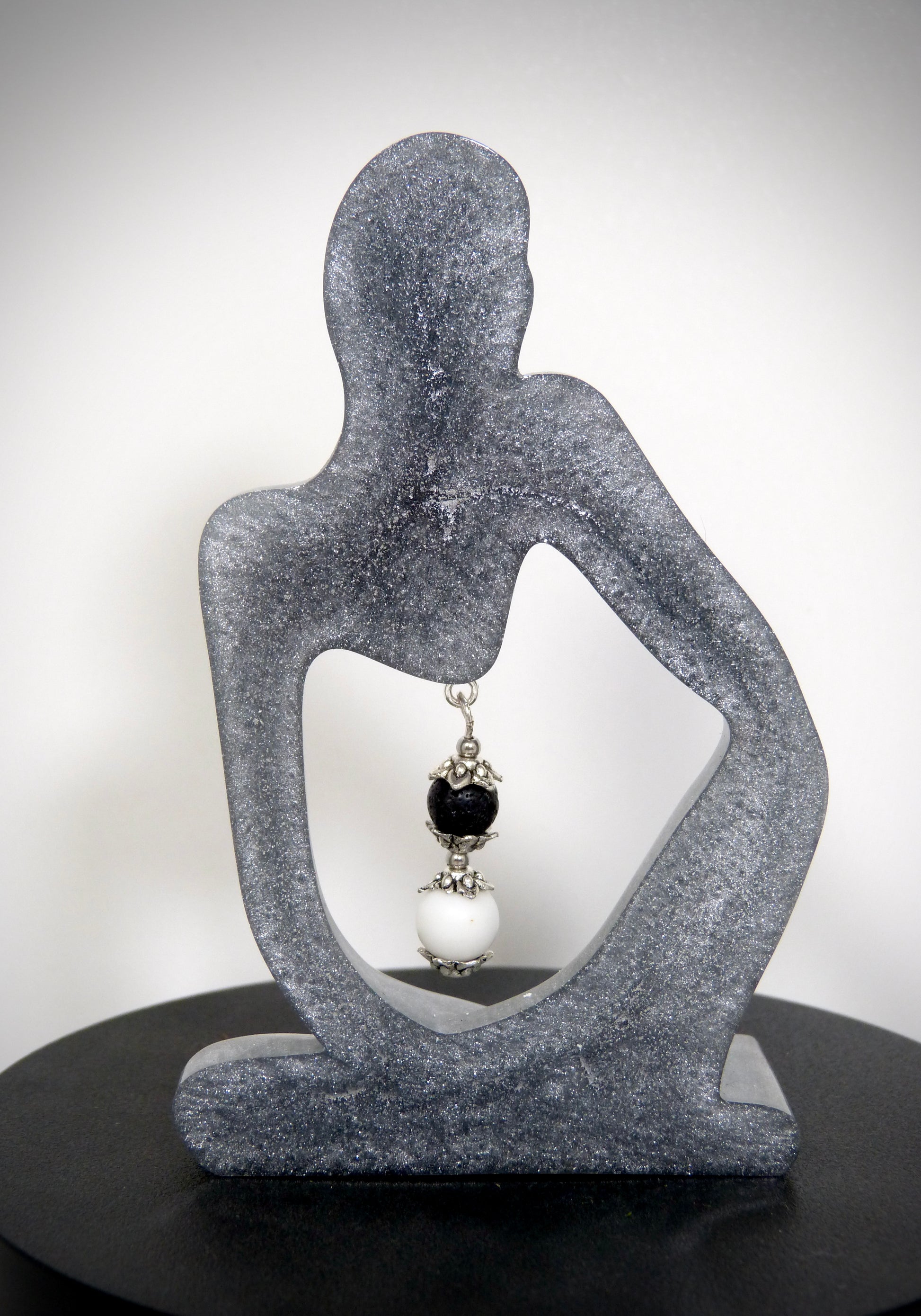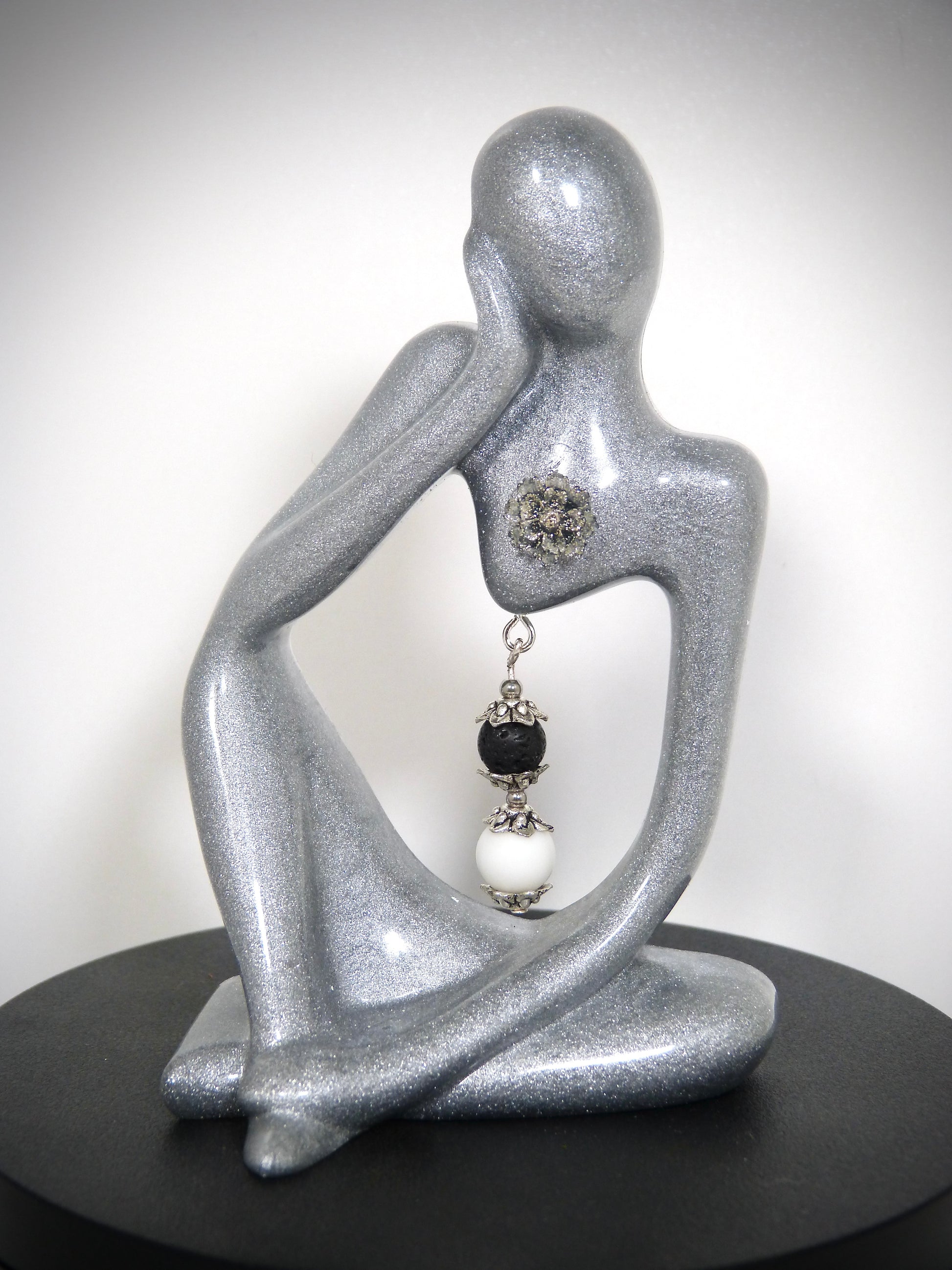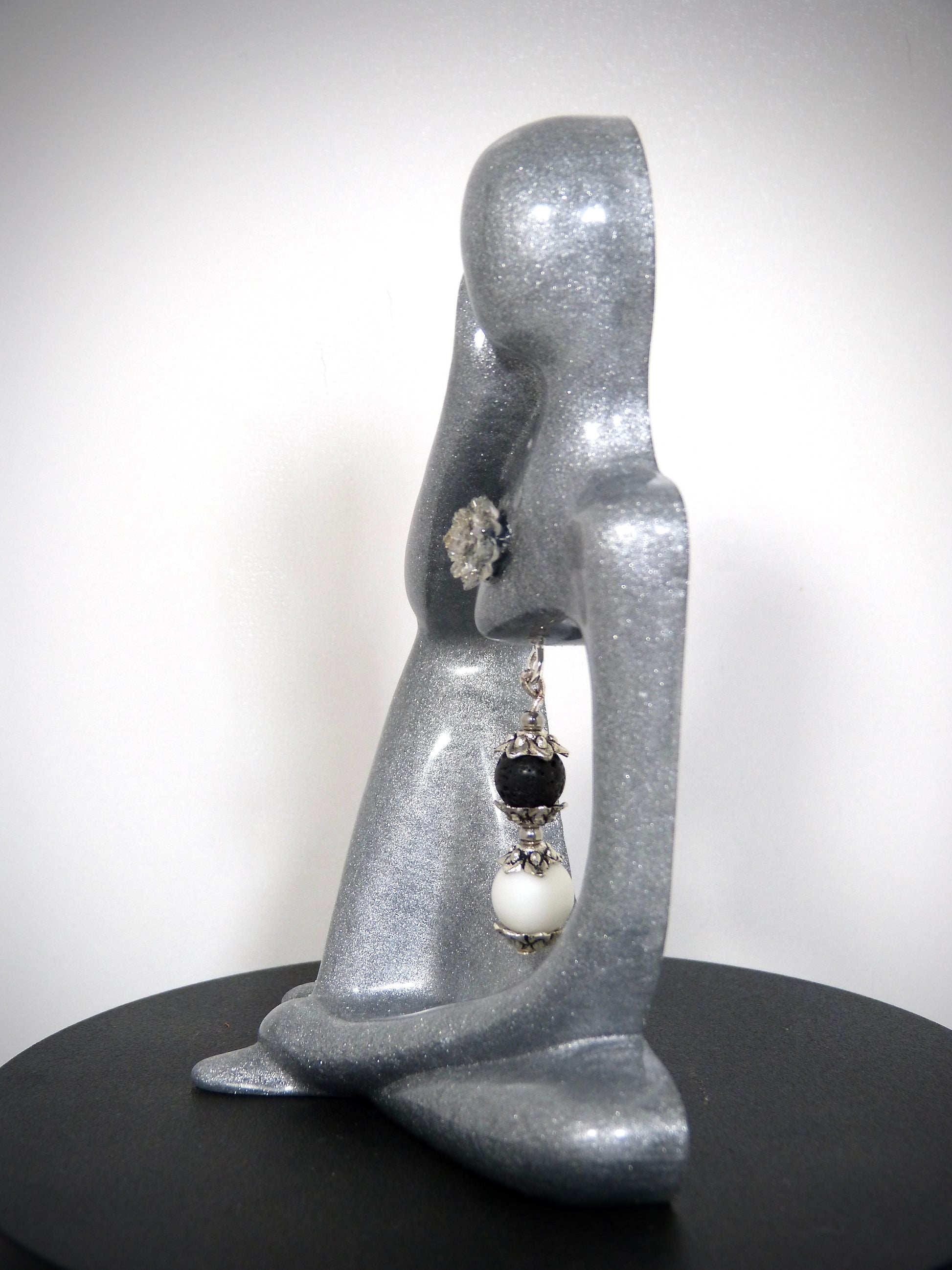 Je vous propose cette magnifique petite statuette fabriquée artisanalement par mes soins avec de la résine, je l'ai agrémenté d'une roses en résine et de deux pierre naturelles de lave blanche de 10 mm et pierre naturelle de lave noire de 8mm, les perles intercalaires sont en alliage d'acier.